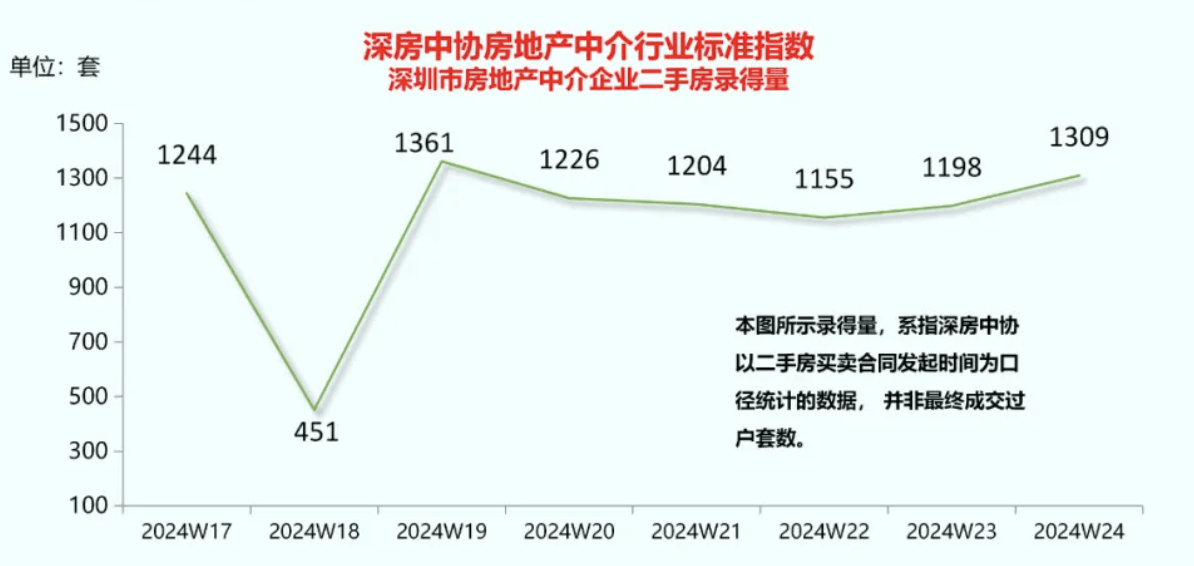 近日,深圳市房地产中介协会发布数据,2024年第24周(6月10日至6月16日),深圳全市二手房成交量(含自助)录得1309套,环比增长9.3%。