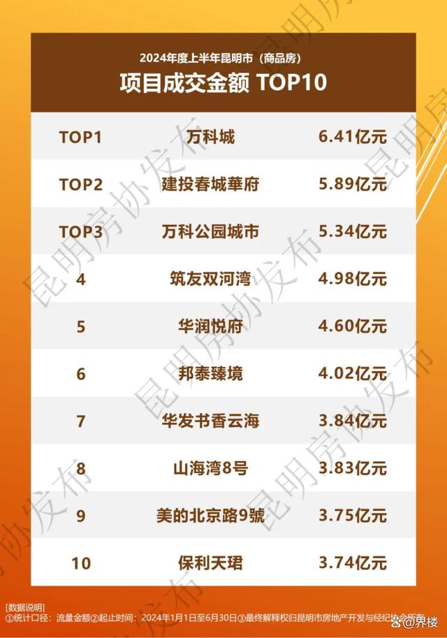 从项目来看,万科城、建投·春城華府和万科·公园城市三个楼盘包揽项目销售金额排名前三,成交金额分别为6.41亿元、5.89亿元、5.34亿元,头部房企业绩断层越来越明显。