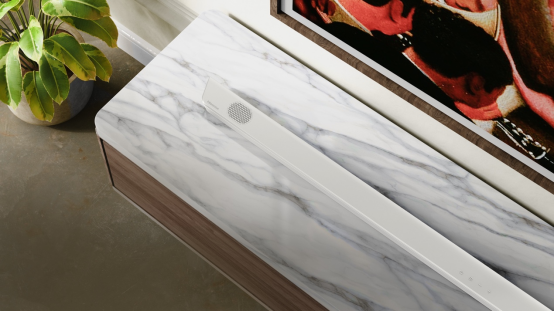 最终面世的Slim Soundbar,拥有楔形纤薄机身,线条流畅充满张力;科学的20°倾角出音设计,使声音直达聆听位,营造出沉浸式的环抱声场。它完美诠释了“功能隐性,美学显性” 的未来家居理念——平时,它是一件优雅的艺术品,悄然融入客厅环境;开机后,它便瞬间化为澎湃的声学核心,带来影院级的观影、游戏和音乐体验。