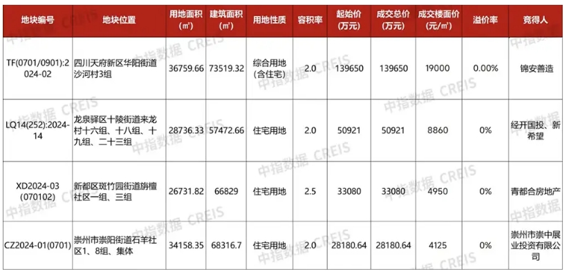 最后,崇州市地块编号为CZ2024-01(0701),位于崇阳街道石羊社区。该地块的建设用地面积为34158.35平方米,规划建筑面积68316.7平方米,容积率为2.0.起拍地价为550万元/亩,折合楼面价为4125元/平方米,该地块最终由崇州市崇中展业投资有限公司以底价竞得。