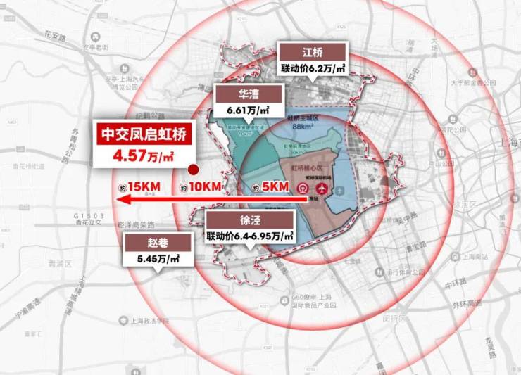 纵观大虹桥核心10KM半径内,与【中交·凤启虹桥】所在的凤溪站在同一梯队,都是徐泾、华漕等重量级热门板块,其中徐泾站稳6.4万/㎡,更有地块联动价达到6.95万/㎡,华漕也突破到6.61万/㎡。由此可见,虹桥核心区准入门槛,已然飙升至600万+起步!