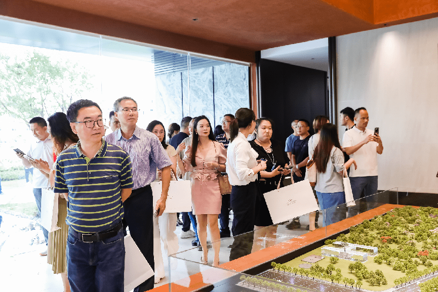 营销中心与样板房开放当天,人声鼎沸。现场就像七八月的天气一样,热火朝天。沙盘区围满了人,洽谈区座无虚席。