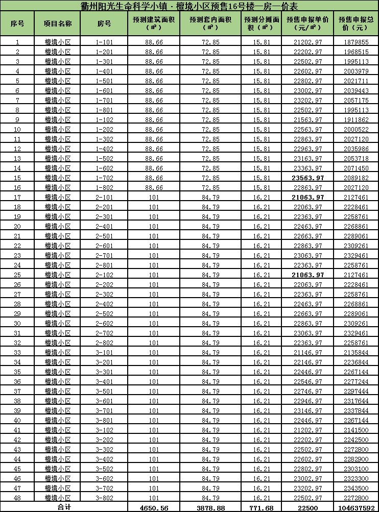 其中普通住宅销售部分96套,普通住宅均价23000元/㎡,面积段约88.66-101.00㎡,面积小计为9301.12㎡;