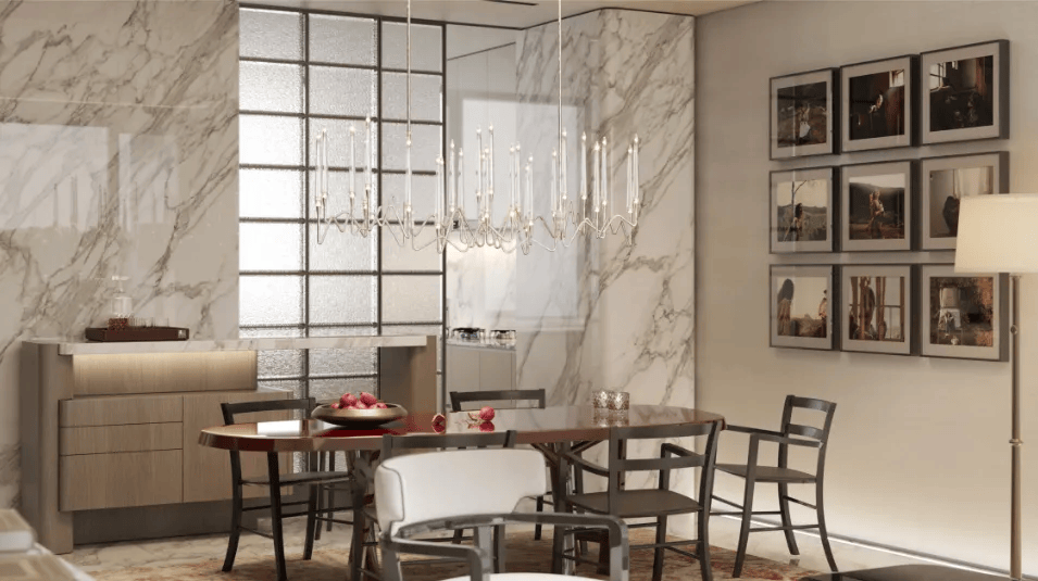 以奢玉、奢石、奢板、奢玻、奢皮,构筑五奢体系,不惜成本,只为集粹精奢质感。入户空间臻选白雪公主玉石,以玉的温润质感装点归家的门庭礼序。