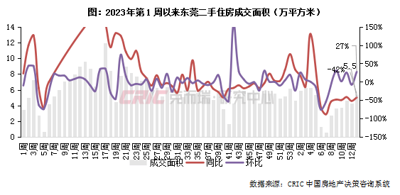 2024年第13周,东莞二手住房成交面积5.5万平方米,环比增长27%,同比下降42%,较周平均值增长30%。