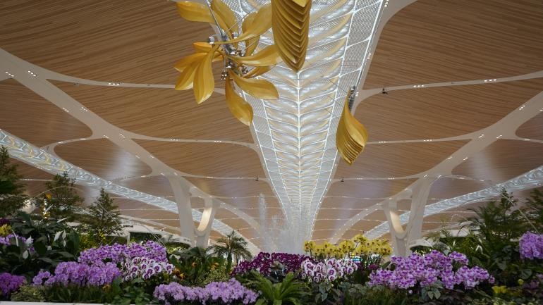 其次,从设计维度看,T3航站楼以“花”为设计主题,是展现广州花城魅力与岭南文化特色的城市窗口。步入其中,以“花”为灵感的建筑美学贯穿登录厅、候机厅与行李提取处,金属线条与光影交织间,岭南传统韵味与现代设计风格无缝衔接,让每一位旅客都能直观感受“羊城”的文化底蕴。
