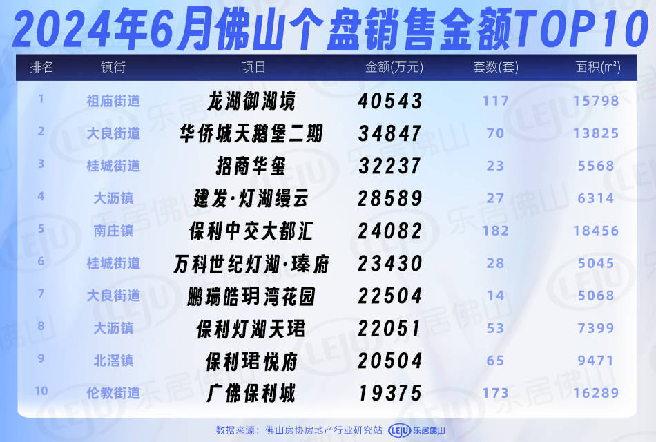 细化到楼盘,金额方面,6月首次开盘的祖庙城央红盘龙湖御湖境以4.05亿问鼎佛山6月销售金额冠军;