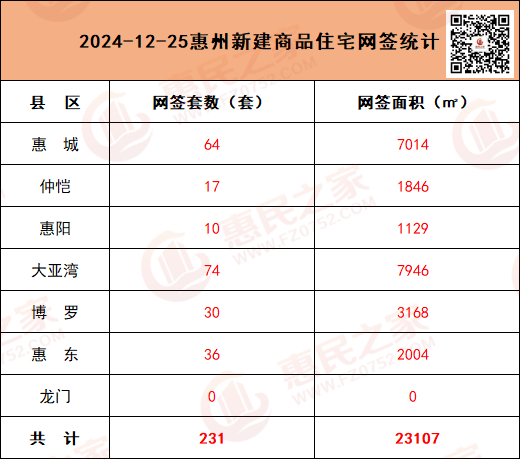 12月25日,惠州全市新建商品住宅共网签231套,网签面积为23107㎡。其中,大亚湾网签74套/7946㎡,居各县区网签量之首。