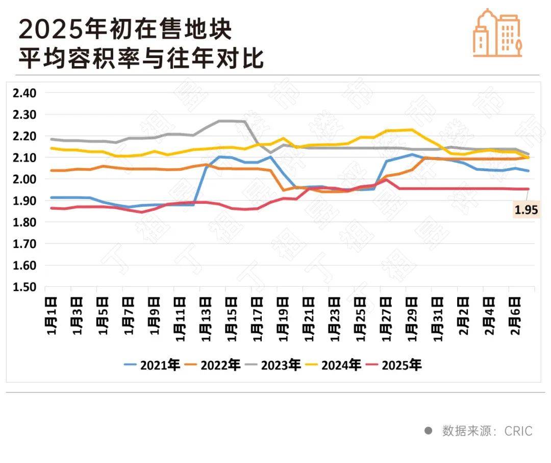 从容积率来看,重点30个城市2025年初在售宅地平均容积率为1.95,维持在2.0以下。而2022年-2024年均在2.1左右。