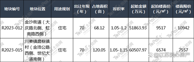 日前,南通市通州自然资源和规划局发布“国有建设用地使用权挂牌出让公告通土告字[2023]第15号”,公告内挂牌2宗低密宅地,编号分别为R2023-012、R2023-0015。两宗地块分别位于金沙街道以及川姜镇磨框镇村,总占地面积125452㎡(约188.2亩),起拍总金额约11.24亿元。