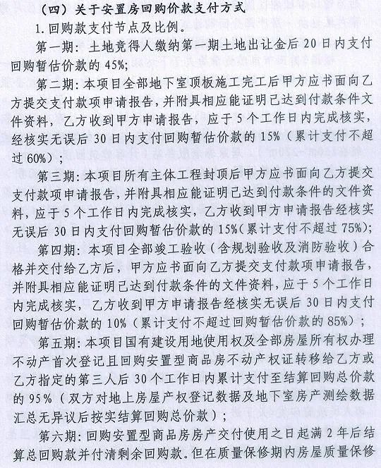 2. 该地块规划回购住宅面积约29225㎡、商业面积约3169.2㎡,回购地下车位200个,设定回购款支付节点及比例(共为6期),回购安置型商品房房产交付使用之日起满2年后结算总回购并付清剩余回购价款,具有一定的回款周期,需要开发商有一定的操盘实力。