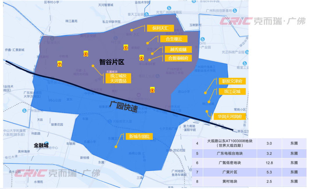 2025年东圃板块计划供应地块基本位于天河智谷内,目前智谷内部在售项目主要集中在东部牛奶厂片区,以大面积改善产品为主。刚需刚改产品主要位于吉山片区。