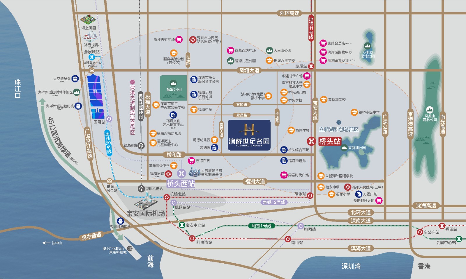 1.鸿桥世纪名园在新兴居住板块内,依托多重核心战略和宝安区西部城市中心的开发,整体配套环境和项目局部兑现情况可观。毗邻地铁11号线桥头站,通达性好。