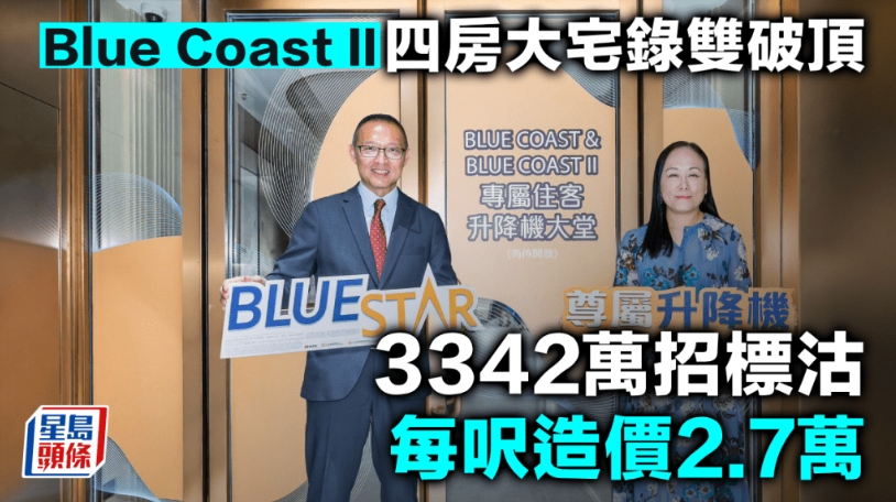 长实旗下黄竹坑站上盖港岛南岸新盘Blue Coast II今日以招标形式售出1伙4房双套连储物房及洗手间,为3座25楼B室,面积1224方呎,成交价3342万元,呎价27304元,成交金额及呎价均创项目新高。 据了解,买家为退休人士,一向钟情南区生活,是次入市作自住之用,认为区内配套完善,加上项目享有专用电梯可直达商场与港铁站无缝连接,升值潜力看高一线。