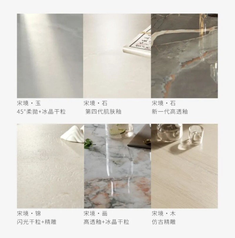 工艺之美:宋境系列拥有45°柔抛、肌肤釉、高透釉、闪光精雕、冰晶干粒、仿古精雕等等6大工艺,可打造与砖面纹理相匹配砖面肌理效果,为消费者提供多样的选择。