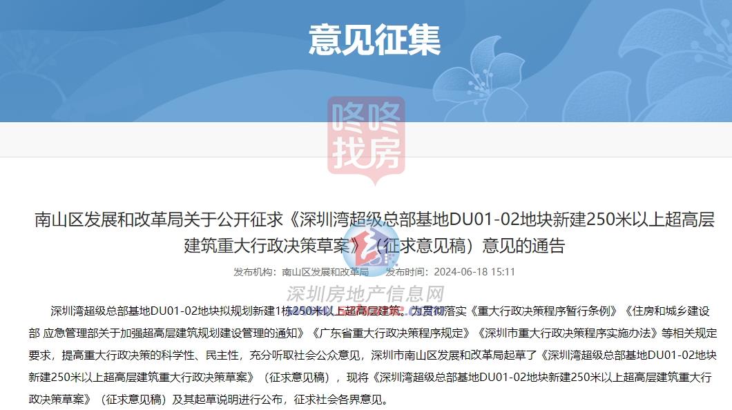 近日,南山区发展和改革局发布《深圳湾超级总部基地DU01-02地块新建250米以上超高层建筑重大行政决策草案》(征求意见稿),公开征求意见。