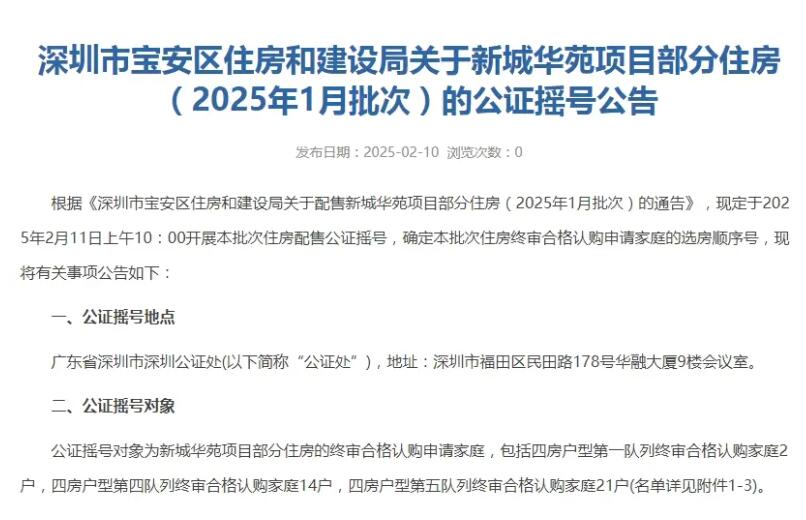 春节假期刚过,深圳的人才房市场便迎来了新动态。日前,宝安区住房和建设局发布消息,新城华苑四房单位预计 2 月 11 日上午 11:00 开展公证摇号,这也是节后首个摇号的人才房项目,备受关注。