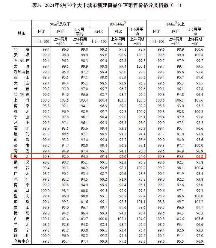 国家统计局发布2024年6月份70个大中城市商品住宅销售价格变动情况统计数据。