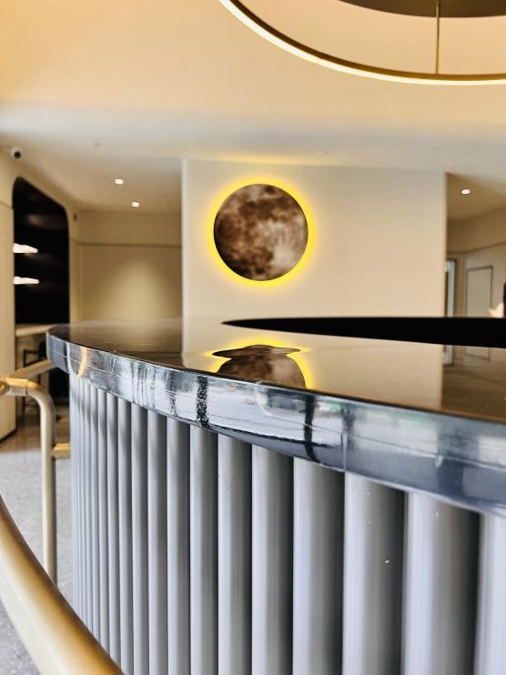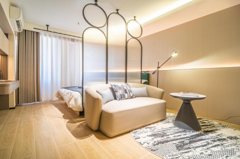 走进乐乎公寓·清河店,仿佛踏入了一个充满设计感与艺术氛围的空间世界。公寓以极简几何语言重构空间秩序,7 米挑高穹顶通过留白设计强化纵向视觉延伸感,营造出开阔、大气的空间氛围。拱形门廊与曲面前台形成流畅的动线引导,让人在不经意间感受到空间的灵动与韵律。