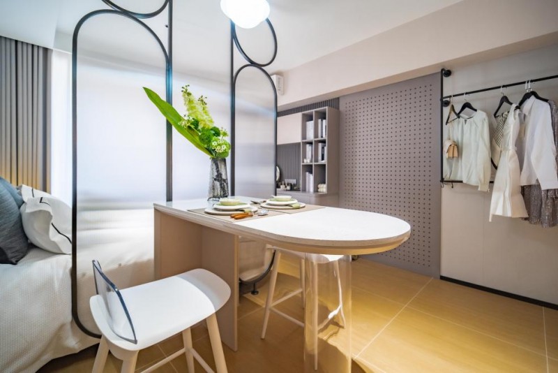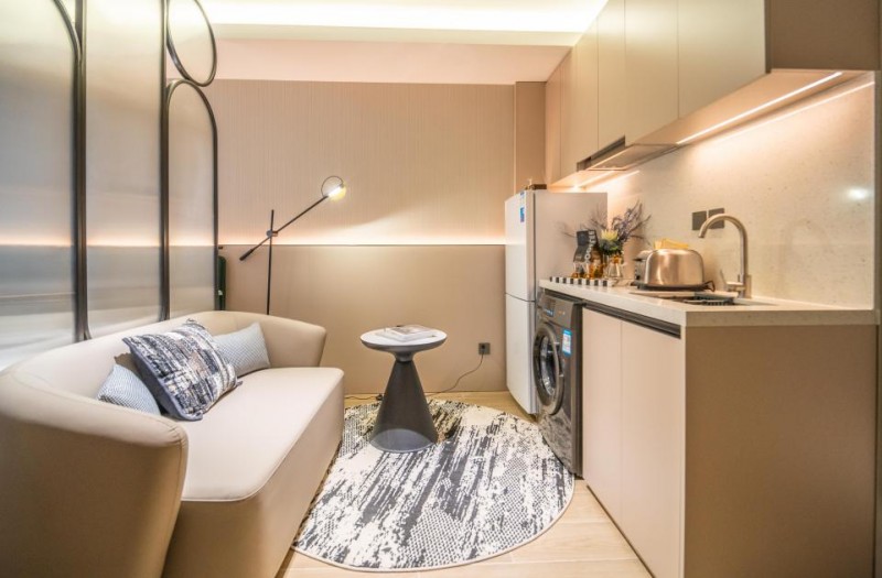 室内设计采用简约风格,配备齐全的家电家具,洗衣机、冰箱、油烟机、热水器等基本生活设施一应俱全,真正实现租客“拎包入住”的便捷体验。同时,项目特别注重空间利用和收纳功能,通过卫浴收纳、橱柜收纳、书桌收纳等多重收纳系统,最大化利用每一寸空间,即使是小户型也能保持整洁有序,让居住更加舒适自在。