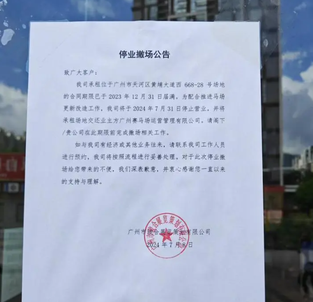12日,记者走访马场内的马会家居发现,卖场的多个出入口玻璃门上张贴着“停业撤场”公告。公告显示:马会家居运营方广州市骏合展览策划有限公司表示,其承租的黄埔大道西668-28号场地已于2023年12月31日届满,为配合推进马场更新改造工作,公司将于2024年7月31日停止营业,并将场地交还给业主方广州赛马场运营管理有限公司,商户需在此期限前完成撤场相关工作。