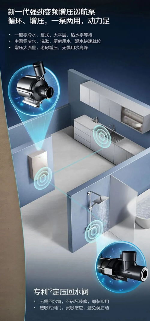 不仅如此,其所采用的专利定压回水阀设计,无需预埋回水管,也不会破坏原有的装修格局,无论是老房焕新,还是复式、大平层等大户型,都能轻松安装,即装即用。