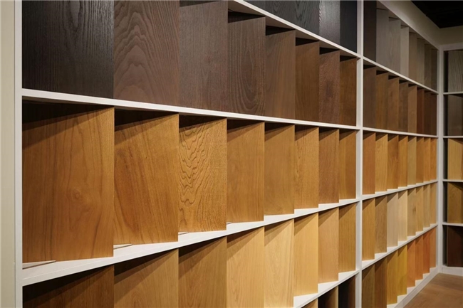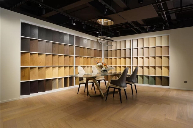 拾级而上,旗舰店二层如多元地板世界的探索实验室,在此,不同参数、不同工艺地板的肌理与特性均可触摸、体验,并在专业导购的辅助下完成科学选材与个性化定制。