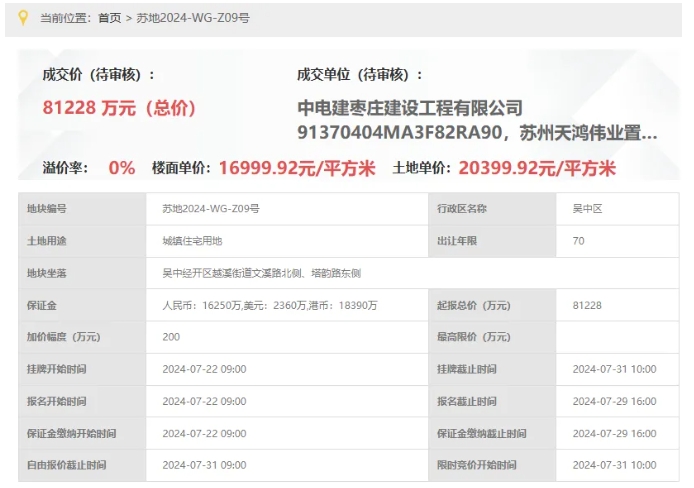 中电建&天鸿伟业越溪9号地块项目,即,苏地2024-WG-Z09号地块,位于吴中经开区越溪街道文溪路北侧、塔韵路东侧,2024年7月31日,中电建&天鸿伟业以底价81228万元竞得,成交楼面价17000元/平。