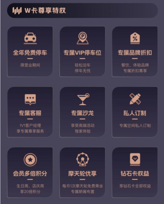2、专属价值:优享生活的“核心魅力”在核心消费场景中,W高端会员体系通过超100+专属品牌折扣,生日当天30倍积分,店庆周、生日周20倍积分等专属权益,强化经济价值与消费粘性;同时,创新推出摩天轮优享、生日场景、求婚场景私人定制、专属沙龙等娱乐体验权益,将服务边界从购物延伸至品质休闲,为会员创造独特的“幸福感”。