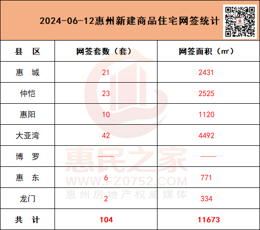 6月12日,惠州全市新建商品住宅共网签104套,网签面积为11673㎡。其中,大亚湾网签42套/4492㎡,居各县区网签量之首。