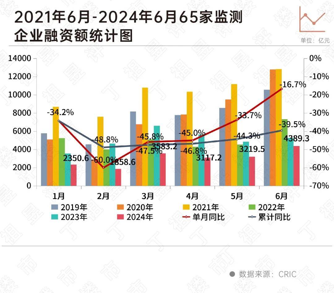 2024年6月65家典型房企的融资总量为319.52亿元,环比减少37.3%,同比减少48%。从上半年累计数据来看,65家典型房企的累计融资总量为2155.01亿元,同比减少35.9%,新增债券类融资成本3.17%,较2023年全年下降0.43个百分点。