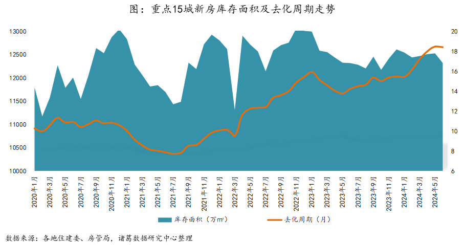 根据诸葛数据研究中心监测数据,2024年6月监测15个城市的新房库存面积为12318.63万㎡,环比下降1.6%,同比持平。去化周期方面,达到18.4个月,较上月减少0.1个月。