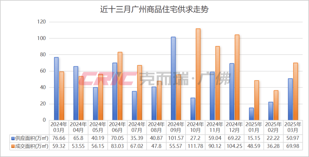 按月度来看,3月广州商品住宅供应面积50.97万㎡,环比翻倍增长,成交面积69.98万㎡,环比增长93%,同比增长22%。