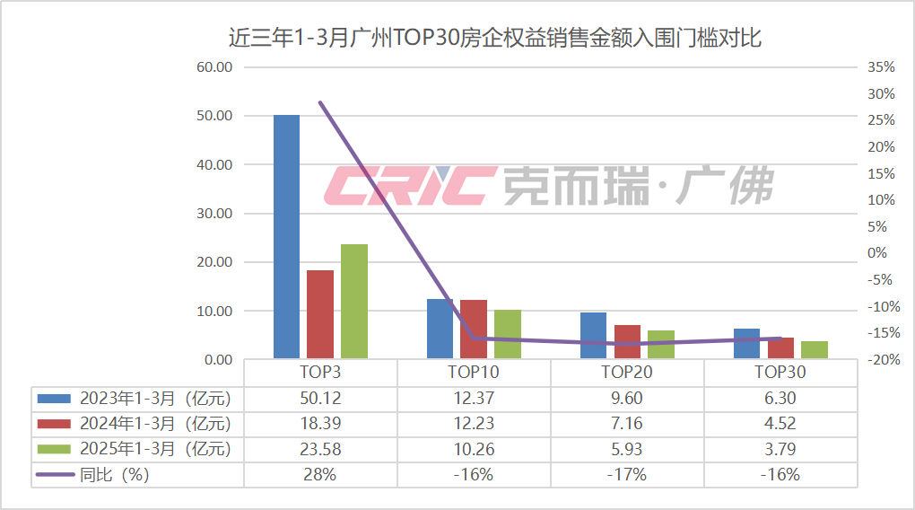 克而瑞数据监测显示,2025年3月广州权益金额TOP30房企销售业绩177.23亿元,同比增长4%,环比增长翻倍,位列近三年月度第二高。