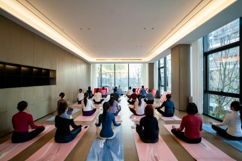 在传统豪宅的认知中,“高端”往往与冰冷的材质、昂贵的装修画上等号。但未来天奕早已打破这种固化思维,将“生活感”作为豪宅营造的核心逻辑。此次lululemon瑜伽活动选址于项目已开放的运动会所内,落地窗外是精心打理的园林景观,室内则配备了专业的瑜伽设施,为业主提供了极致舒适的运动环境。