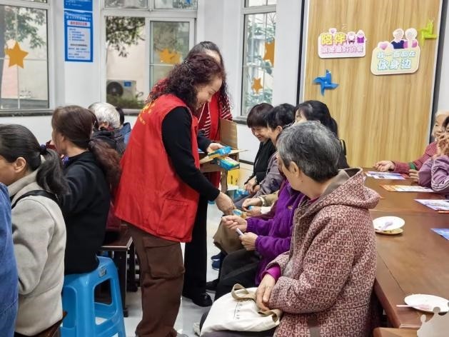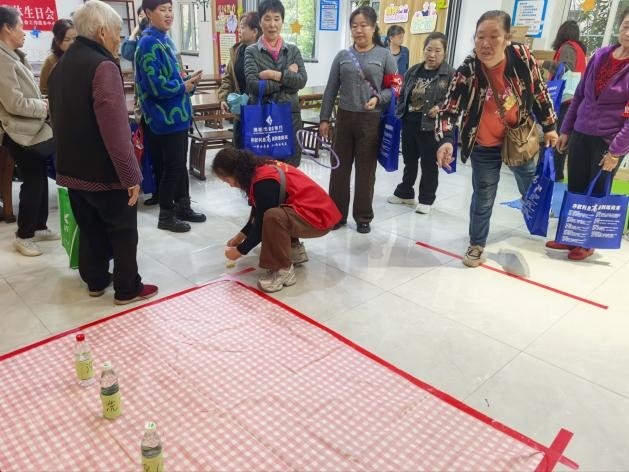 蛋糕分享环节过后,活动进入互动游戏阶段。考虑到秋季气候干燥、昼夜温差大,老年人群体易出现健康问题,社工首先围绕秋季健康养生知识设计了通俗易懂的判断题,题目内容紧密贴合老年人日常生活,全面涵盖秋季饮食禁忌、保暖要点、常见疾病预防等关键方面。题目刚一公布,台下的老年居民便踊跃举手参与答题,张阿姨第一个抢到答题机会,面对“秋季适合多吃梨、银耳等滋阴润燥的食物,这种说法正确吗”的问题,她自信地回答“正确”,不仅顺利获得3个套圈奖励,还补充说道:“我家每天都煮银耳羹,吃了确实不觉得口干了!”引得现场居民纷纷点头赞同。对于答错的居民,社工也暖心送上1个套圈作为鼓励,避免老人产生失落情绪。答题过程中,工作人员还会结合题目对背后的健康知识进行细致讲解,比如解释秋季吃辛辣食物易加重体内燥气,可能导致口干、便秘等问题;提醒“秋冻”要适度,气温过低时需及时增添衣物;针对呼吸道疾病预防,建议老人减少去人群密集场所,勤开窗通风,保持室内空气流通。通过这种问答结合讲解的形式,让居民在轻松互动的同时,扎实巩固了秋季养生常识。