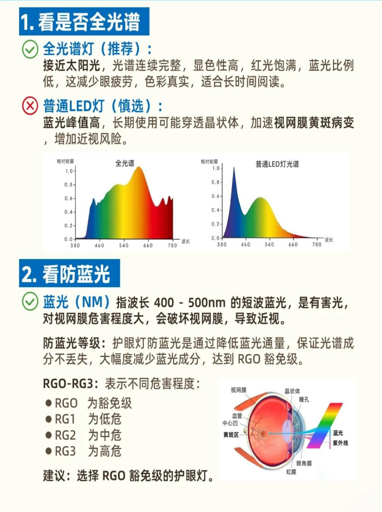 眩光控制同样不可忽视,UGR(眩光指数)应低于19,优选UGR≤14的产品,以减轻眩光对眼睛的刺激。护眼性能方面,需关注蓝光危害等级,应选择RG0豁免级别,从根本上降低蓝光损伤。此外,无频闪设计能有效防止眼酸、头痛等问题。