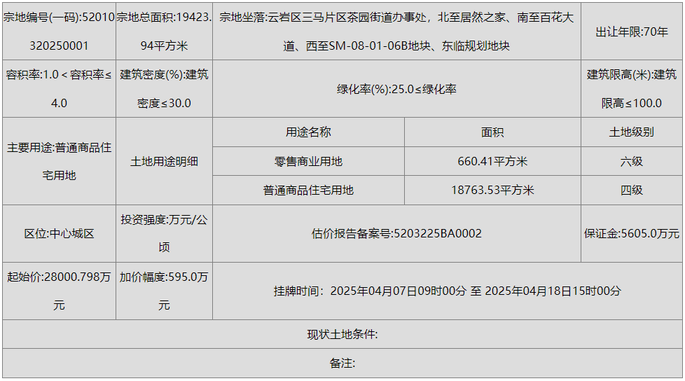 宗地编号为52010320250001的地块,位于云岩区三马片区茶园街道办事处,北至居然之家、南至百花大道、西至SM-08-01-06B地块、东临规划地块。土地用途为普通商品住宅用地、零售商业用地,面积为19423.94平方米(其中住宅用地18763.53平方米,零食商业用地660.41平方米),出让年限为70年。容积率:1.0≤容积率≤4.0.建筑密度≤30.0% ,建筑限高≤100米,绿化率≥25.0%。