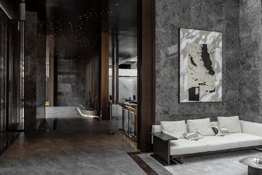 再往里走,就是酒店式大堂接待区,由奢石+冷翡翠打造而成的背景和台面,外行人都能看出价值不菲。