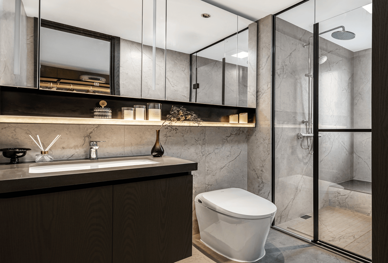 如收纳柜暗拉手设计、户内静音门锁、柜内防霉透气孔、淋浴区挡水石止水钢板、橱柜三重灯光、美妆镜前无影化妆灯等等,质感之间相互碰撞,于细节处打造佛山天花板级别高定奢装。