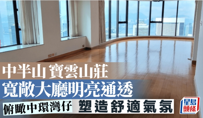 中半山老牌豪宅宝云山庄,位于宁静豪宅地段。 今日为大家介绍盘高层B室,实用面积1657方呎,3房1套连储物室。 单位楼底高,尽显空间感,一列落地弧形玻璃设计,令观景角度更广更远,俯瞰中环及湾仔一带维港景色,视野辽阔。
