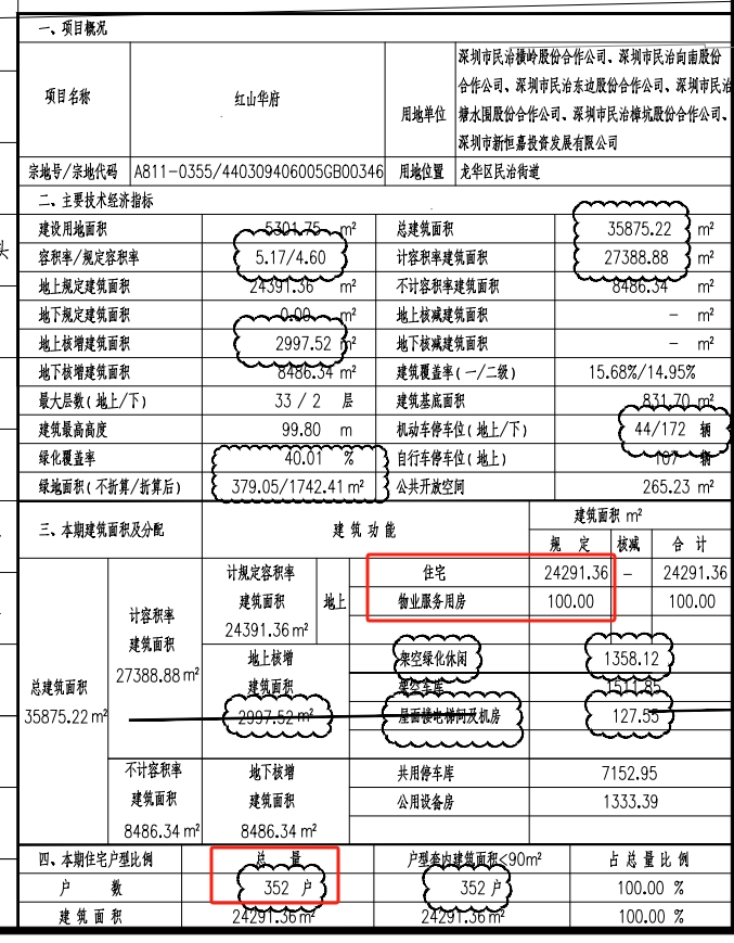 项目总共有352户,其中商品房186户,其余都是回迁房。这里需要注意的是,项目总车位数220个,车位比1:0.63,车位略为紧张。