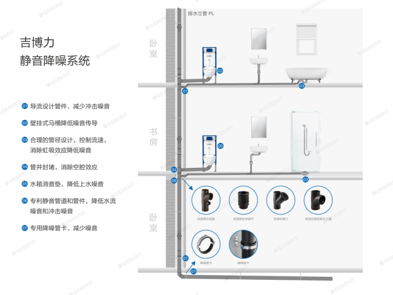 经欧洲最大的应用研究机构Fraunhofer及国标CJ/T 312-2009《建筑排水管道系统噪声测试方法》权威验证,吉博力系统化的静音排水解决方案在不同建筑结构中,排水噪声可降至20分贝左右,远优于《住宅项目规范》低于33dB的限值要求。